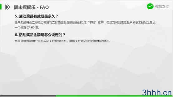 每周六、周日,用户到线下商户门店(商业支付)使用微信支付后即可摇一摇抽奖,最高免单,